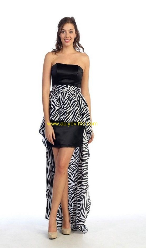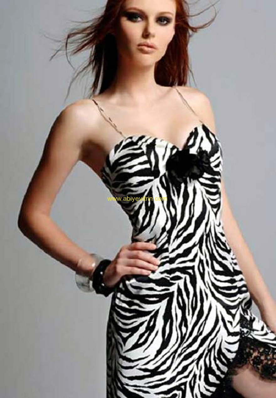 Abiyelerde komple zebra desenin kullanıldığı gibi tek renk kumaş ve zebra desenli kumaştan oluşan abiyelerde rastlamak mümkün.Her davette şıklığınızla adınızdan söz ettirmek istiyorsanız mutlaka zebra desenli abiye denemelisiniz.Askılı, straplez, uzun, mini başta olmak üzere dekoltelerinde cesurca kullanıldığı modeller her zevkten bayanın beklentisini fazlasıyla karşılıyor.Fazla abartıdan hoşlanıyorsanız mutlaka taş işlemeli modellerini tercih etmelisiniz.